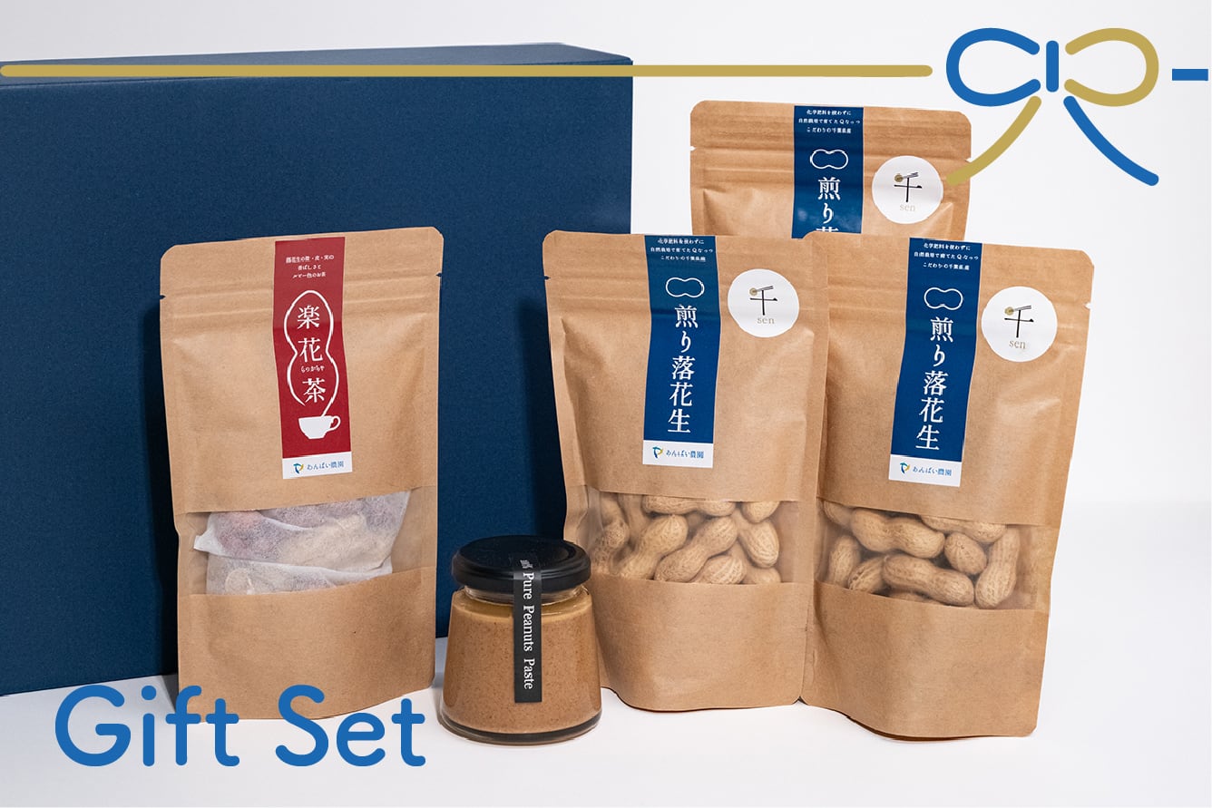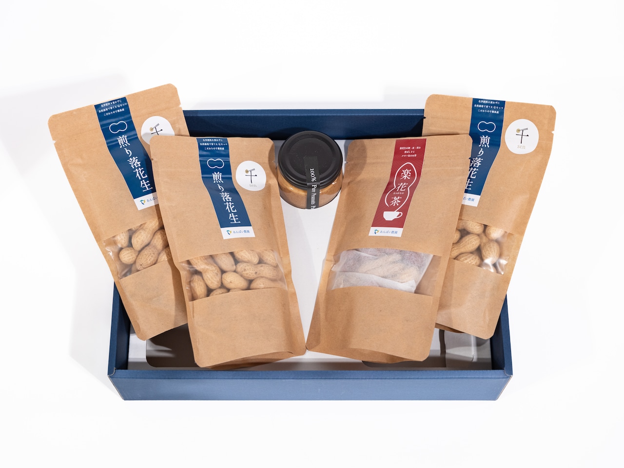 煎り落花生小パック 3個、楽花茶3包入、100%ピーナッツペースト130g