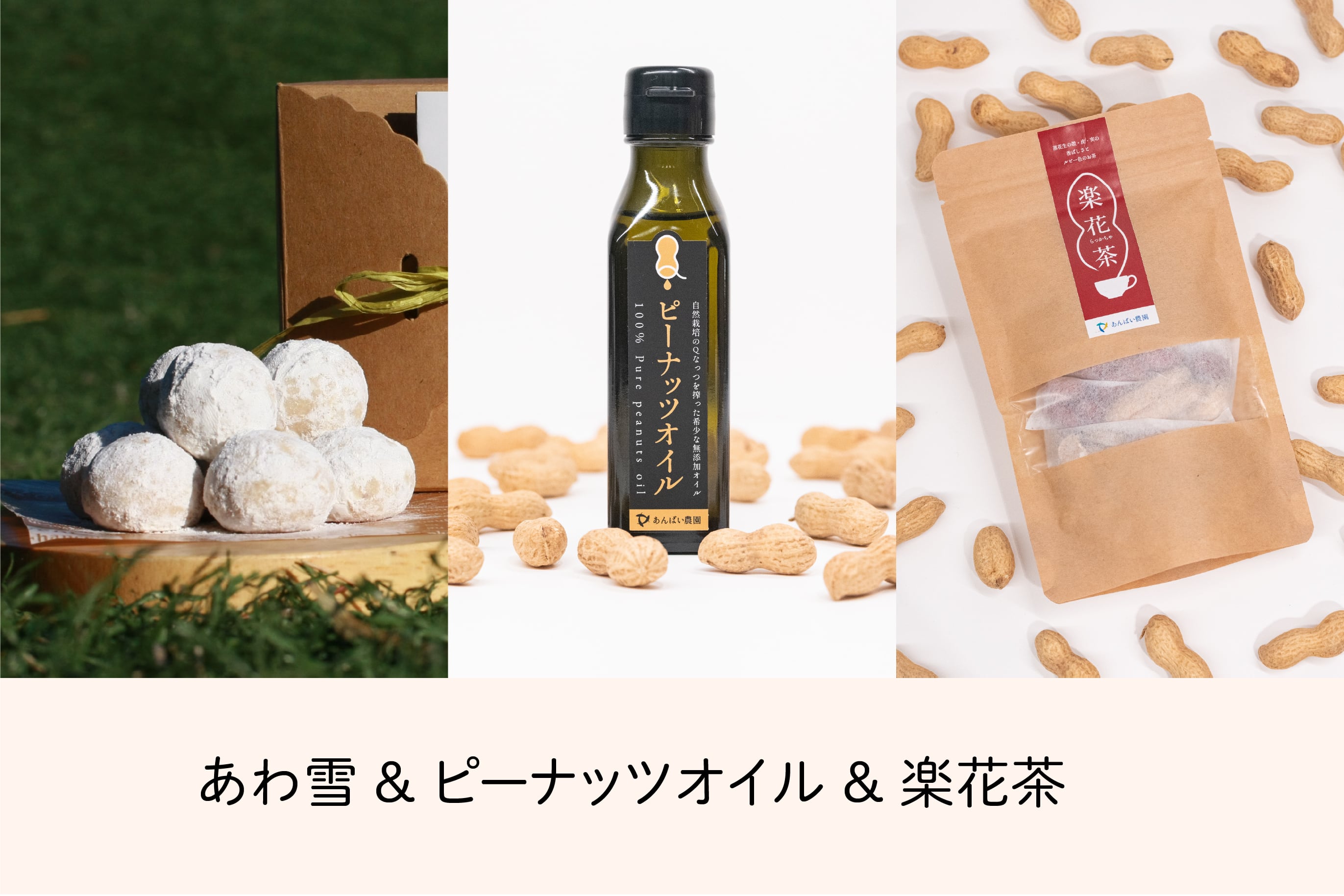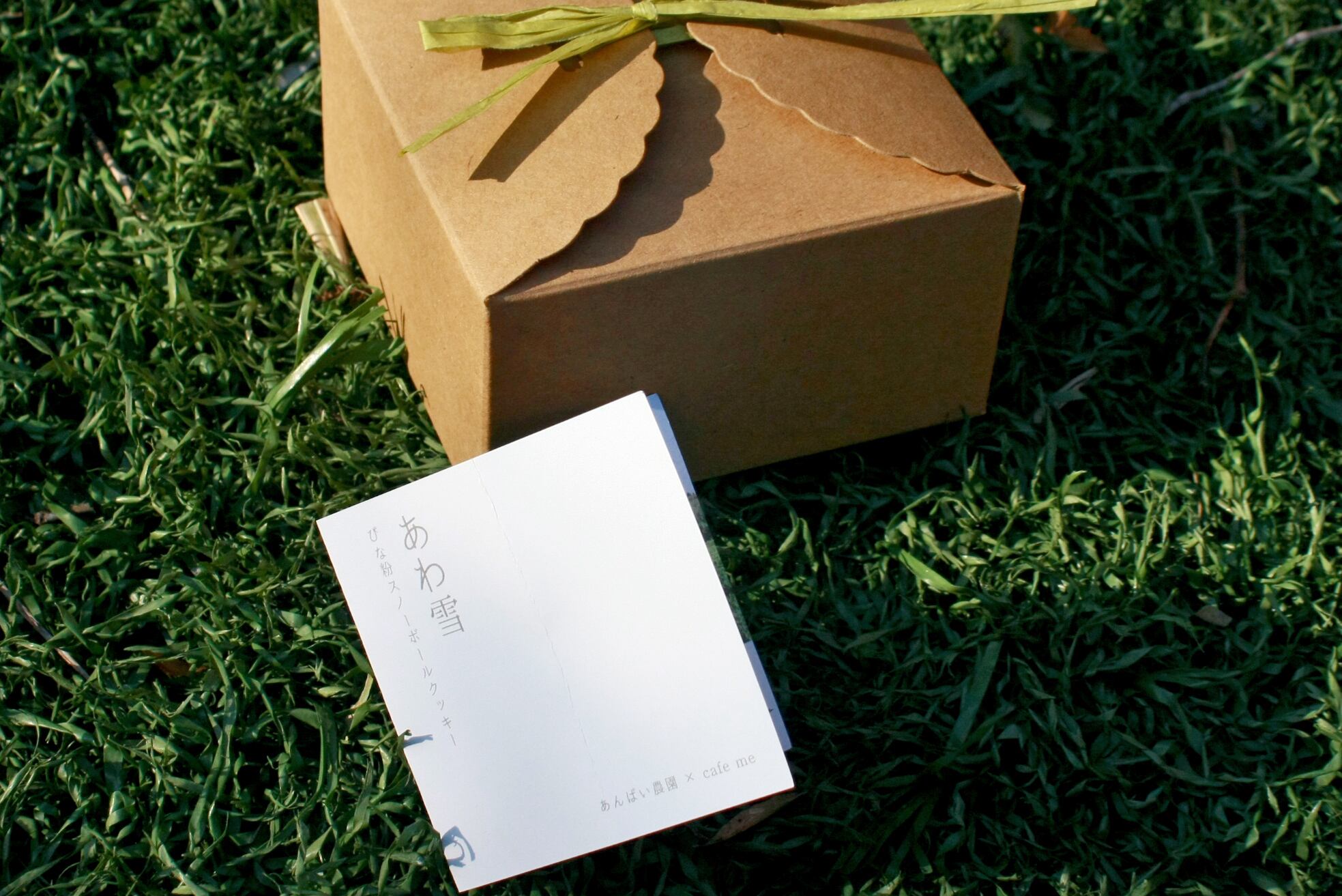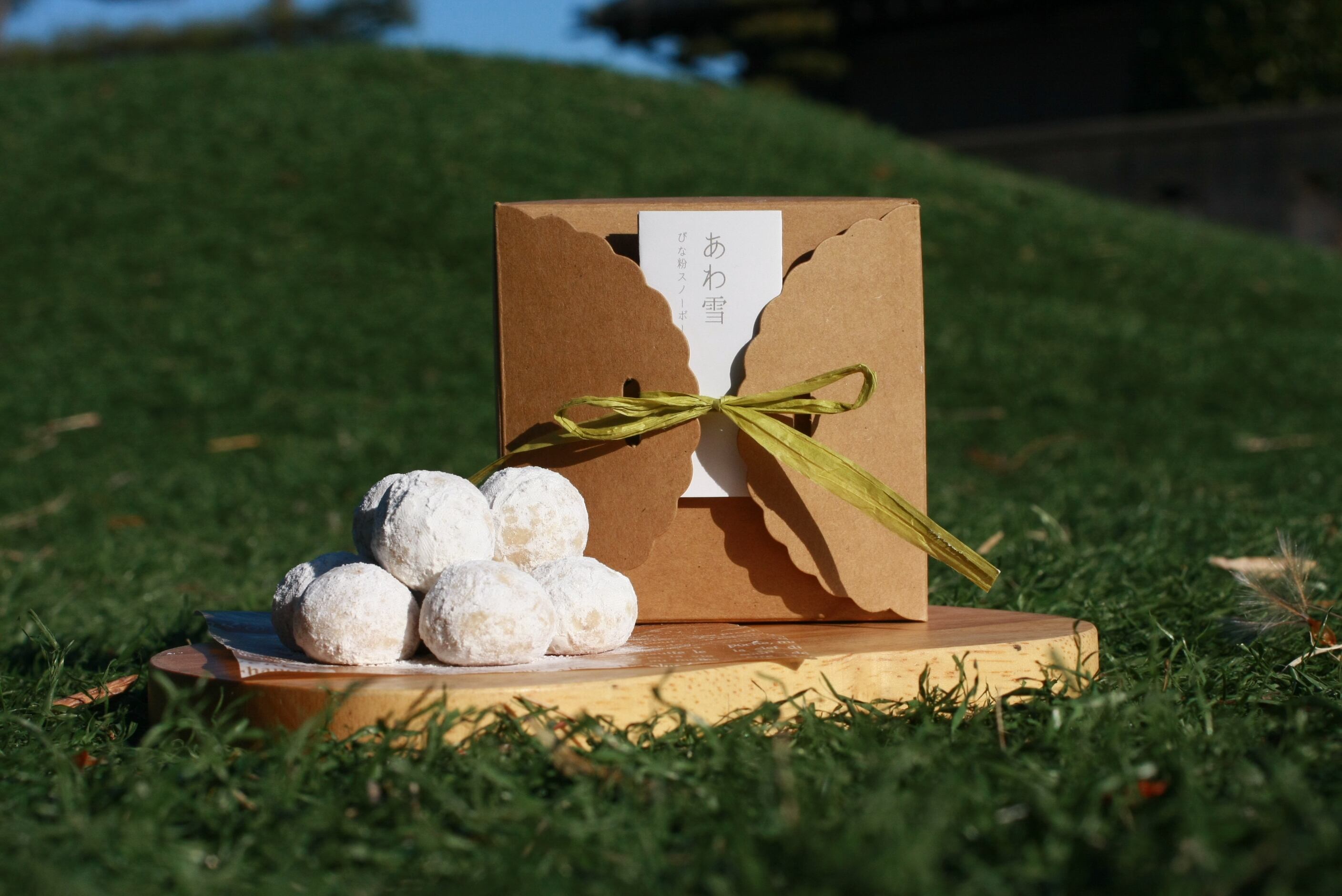 開発・製造を担ってくださったcafe meさんが試作を重ねる中で行き着いたのが、 「崩れる」のではなく「溶ける」食感のスノーボールクッキーでした。淡く儚い口どけとともに、ぴな粉の落花生の香ばしさがふわりと広がる印象的な食感から、 シンガーソングライターのゆうなみさんが「あわ雪」と名付けてくださいました。